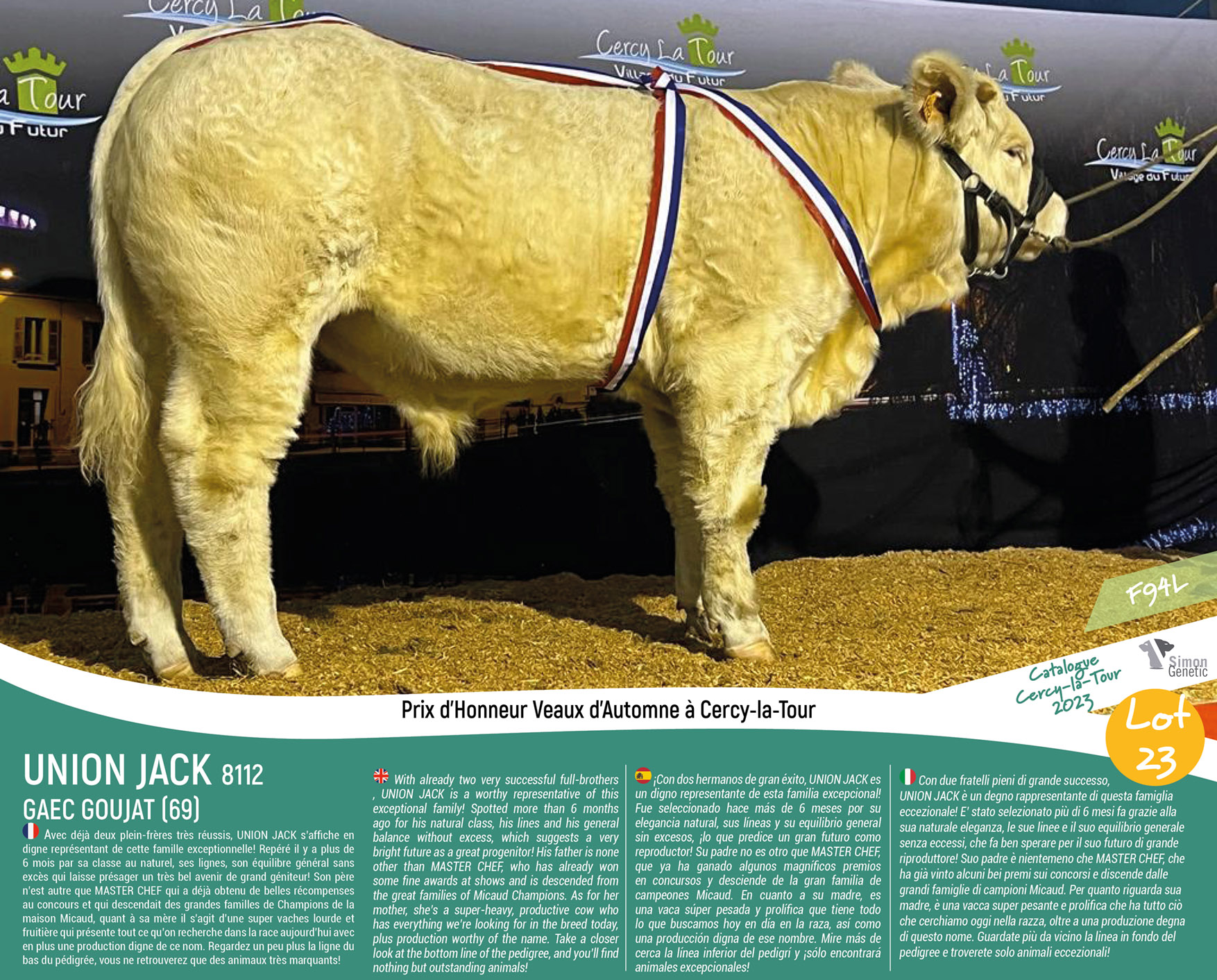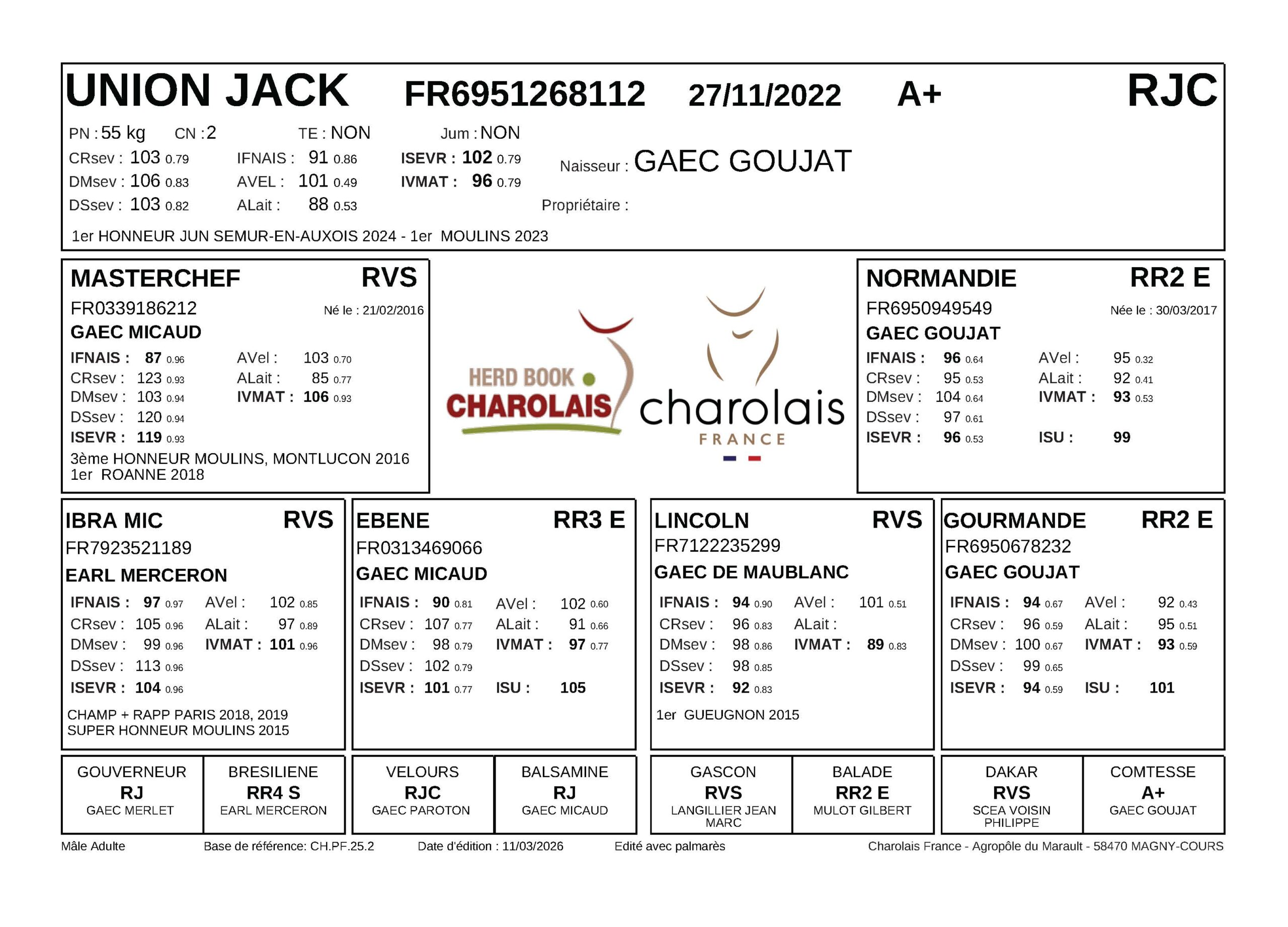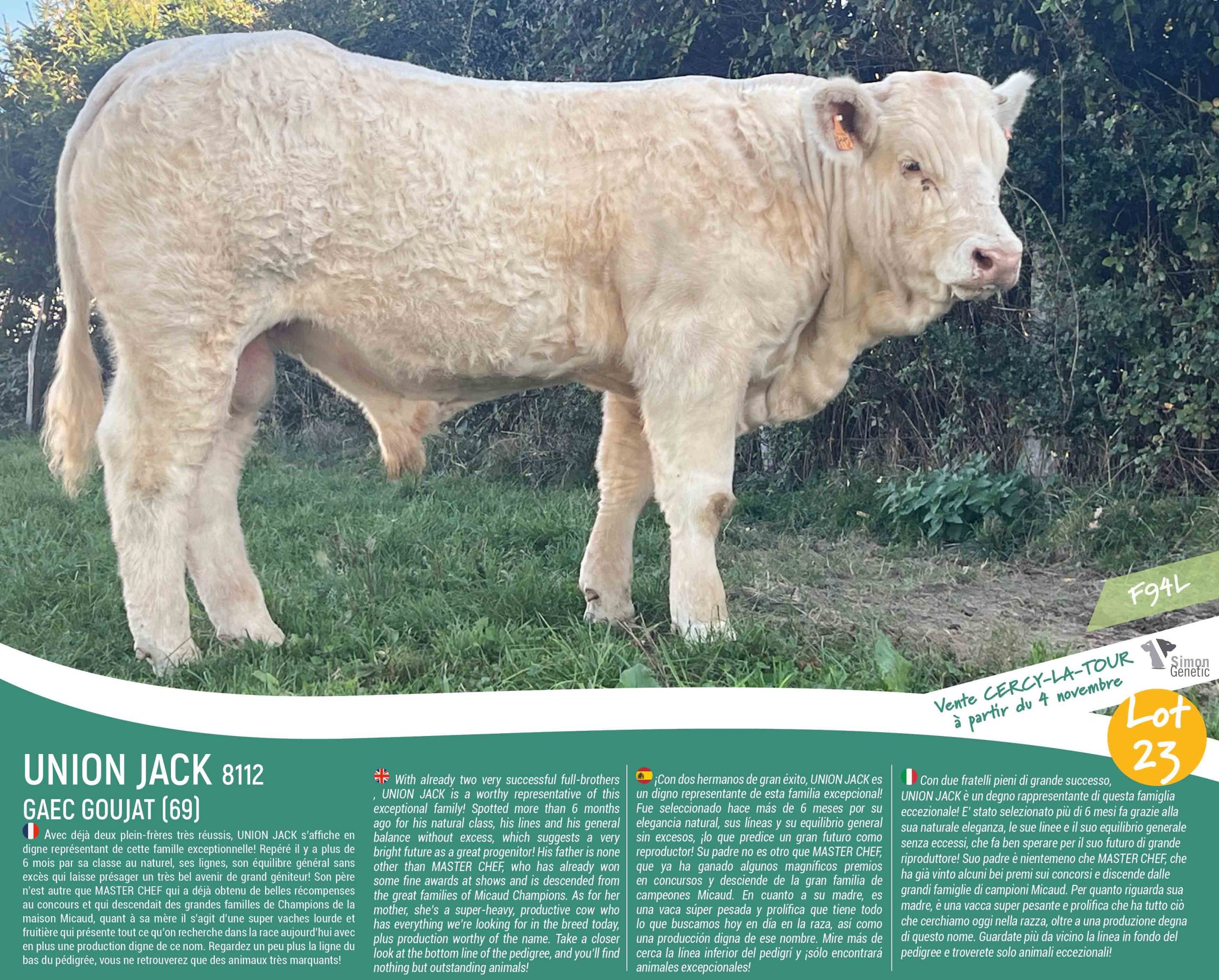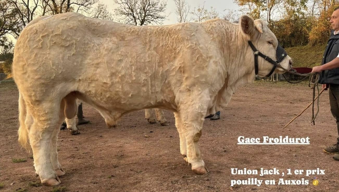 UNION JACK est un jeune taureau né au GAEC Goujat dans le Rhône, particulièrement plaisant lors de la tournée de sélection de la vente de Cercy-La-Tour…