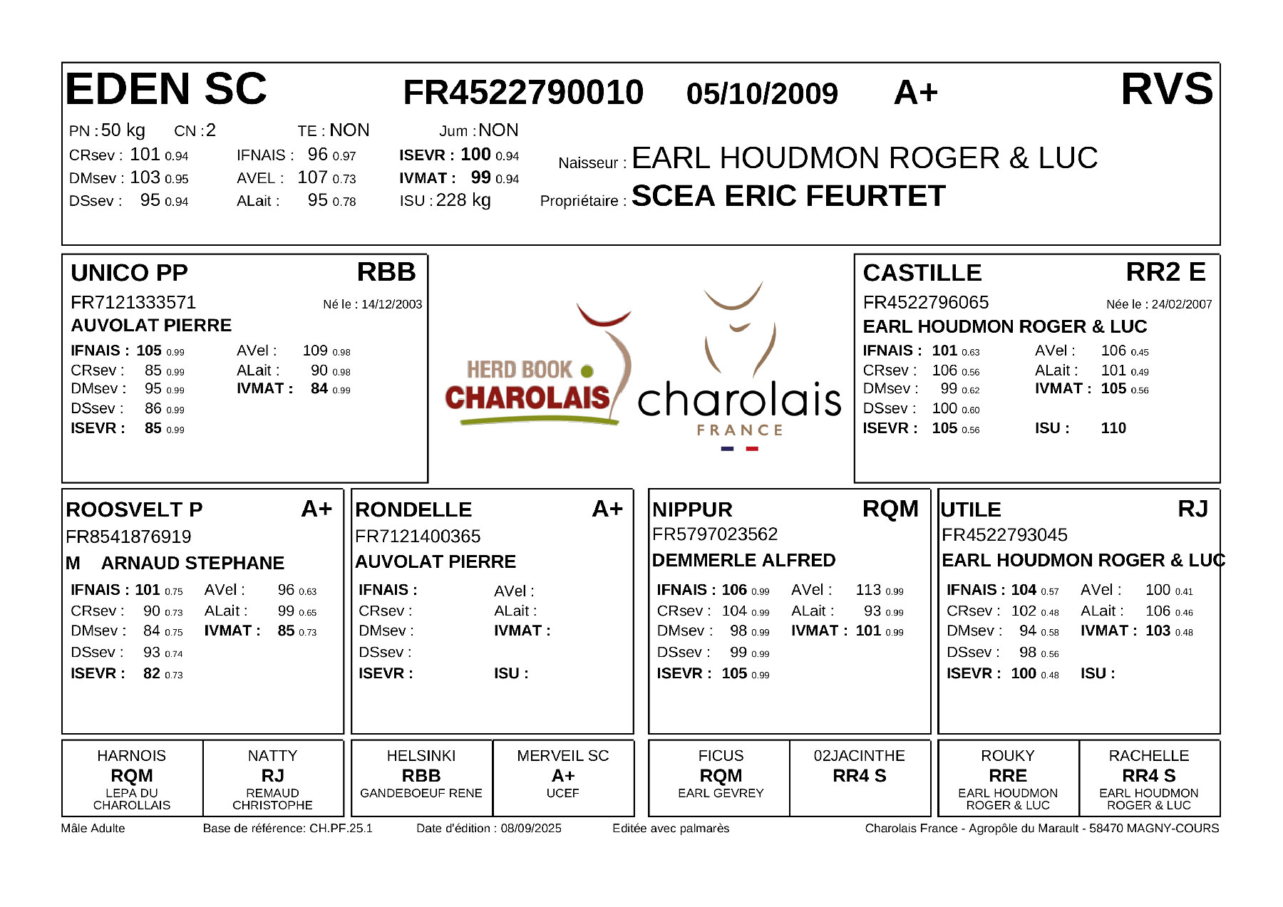 EDEN SC est un taureau hétérozygote Sans-Corne (Polled) qui n’a pas fini de faire des envieux dans sa catégorie puisqu’il présente aujourd’hui une morphologie d’exception et à l’air de bien vouloir transmettre ses qualités à sa descendance. Ce très gros taureau dépasse largement la barre des 1400 kg à ce jour, pas commun pour un animal génétiquement Sans-Corne n’est ce pas ? En plus de cela il se caractérise par de très belles longueurs, des os fins, très droits et solides tout en ayant un carré de bassin très marqué et une très bonne profondeur de corps ! Ce n’est pas d’aujourd’hui qu’il apparaît comme un animal très attrayant puisqu’il était déjà le Top Price de la vente aux enchères de la Station UCC de Migennes lors de son acquisition par l’élevage Mandron Laurent dans l’Yonne. Côté production il a laissé de très belles filles dans l’élevage qui élèvent bien leur veau et qui semblent remarquables au niveau des aptitudes au vêlage (photo ci-dessous). A noter que l’intérêt de ses produits semble dépasser les frontières du territoire national puisque plusieurs de ses filles ont été vendues en Irlande par Simon Genetic. Côté mâles on a des descendants qui naissent sans trop de difficulté et qui exprime ensuite un très bon potentiel de croissance, font un bon développement squelettique sur lequel le développement musculaire semble dominer. Un de ses fils est en phase de testage dans le schéma de sélection de Gènes Diffusion actuellement.