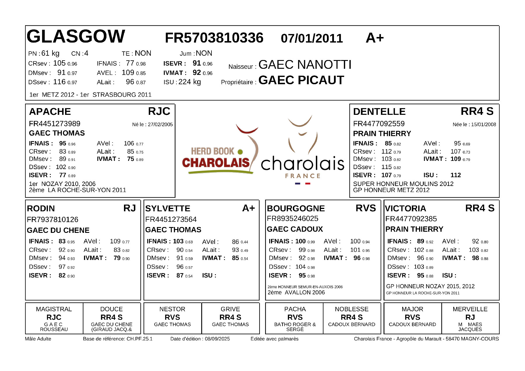 GLASGOW est un jeune taureau au potentiel exceptionnel. Après s’être distingué dans les concours de l’est de la France, il ressort aujourd’hui comme un animal très développant, de la race tant dans la gueule que la cornure, une rectitude au top du top, une super finesse de viande et un très bon bassin. Ces nés au GAEC Picaut ont très bien fonctionnés que ce soit au niveau des mâles avec de nombreux reproducteurs vendus ou au niveau des femelles : ses premières filles ont un morphologie impressionnante en gabarit et font parfaitement bien les veaux ! Ce taureau laisse donc présager beaucoup de correction par toutes ses qualités. Cela n’est pas le fruit du hasard puisqu’il est le produit d’une lignée prestigieuse de la race. En effet sa lignée maternelle est tout simplement exceptionnelle, à commencer par sa mère DENTELLE qui s’est illustrée au concours de Moulins 2012 en obtenant le titre suprême de Super Prix d’Honneur (acquisition du GAEC Nanotti – 57, son deuxième veau mâle a été vendu aux enchères à Charolles en 2013 et a rejoint l’élevage Micaud – 03). Notons aussi que DENTELLE est la pleine-sœur de CADIX qui a été Championne Sénior Réserve au Spécial à Saulieu 2012. Ensuite on retrouve en tant que grand-père paternel le très connu BOURGOGNE (issu du célèbre croisement de deux illustres animaux du GAEC CADOUX -89- PACHA / NOBLESSE) et la non moins connue VICTORIA de l’élevage Thierry Prain (44). Cette dernière s’est démarquée de nombreuses fois au prix de famille par la mère au concours national des adultes : 2010, 2011, 2012 et 2013 ! Nul doute, VICTORIA a bien pris le chemin de ses parents : MERVEILLE (vache qui a plus de 80 veaux à son actif !) et MAJOR (Champion de Paris 1999 et Rappel en 2000).