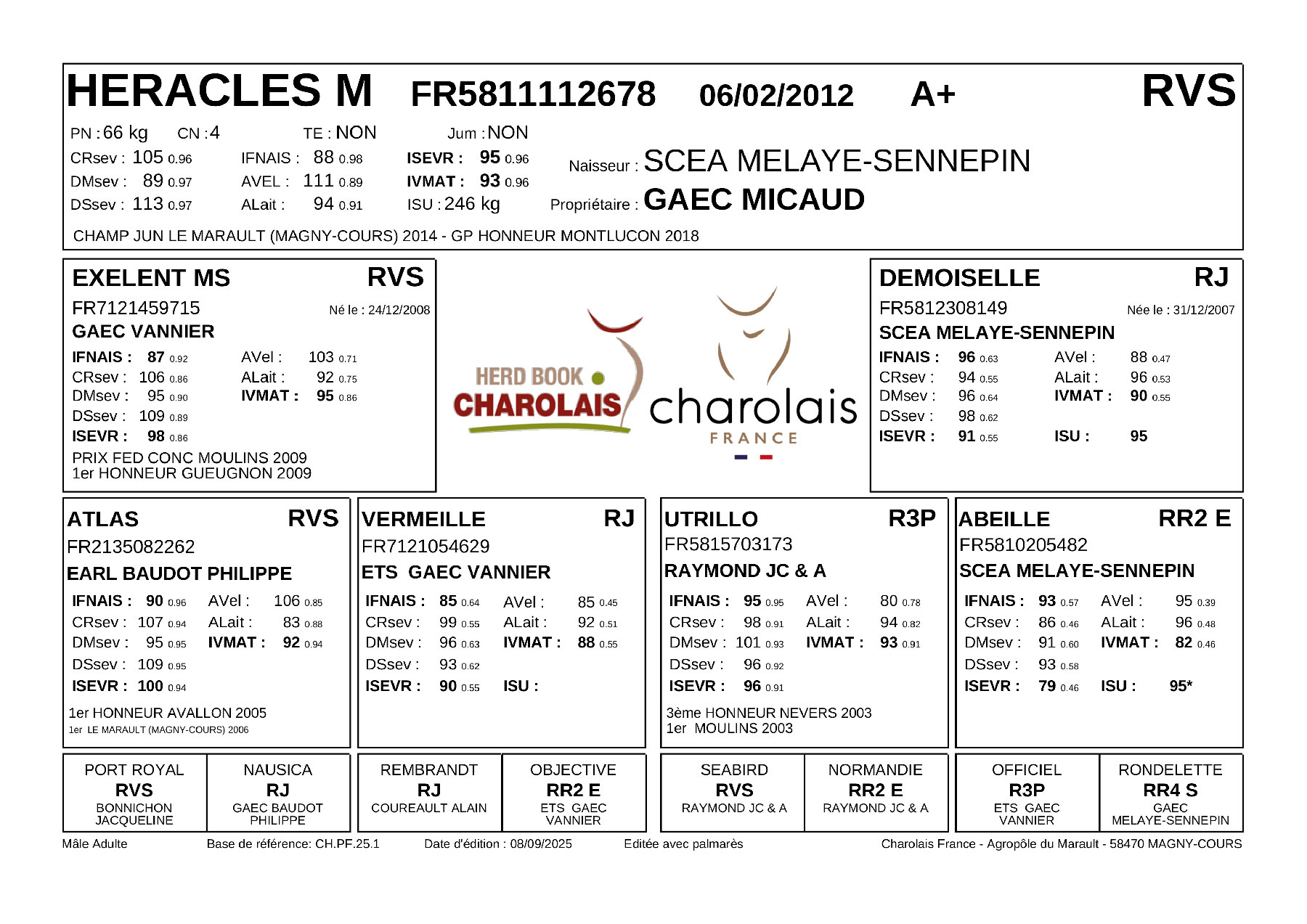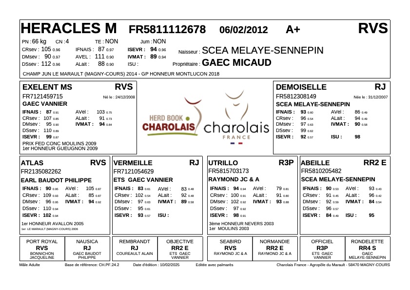 HERACLES M ou le Raceur incontesté ces dernières années au GAEC Micaud ! Ce taureau au potentiel de 1650 kg surclasse les sections depuis son plus jeune âge par sa classe naturelle irréprochable, toute sa prestance à la marche, son gabarit toujours supérieur à ses contemporains, son bassin plat et bien dessiné, sa finesse de cuire et son dos exceptionnel !