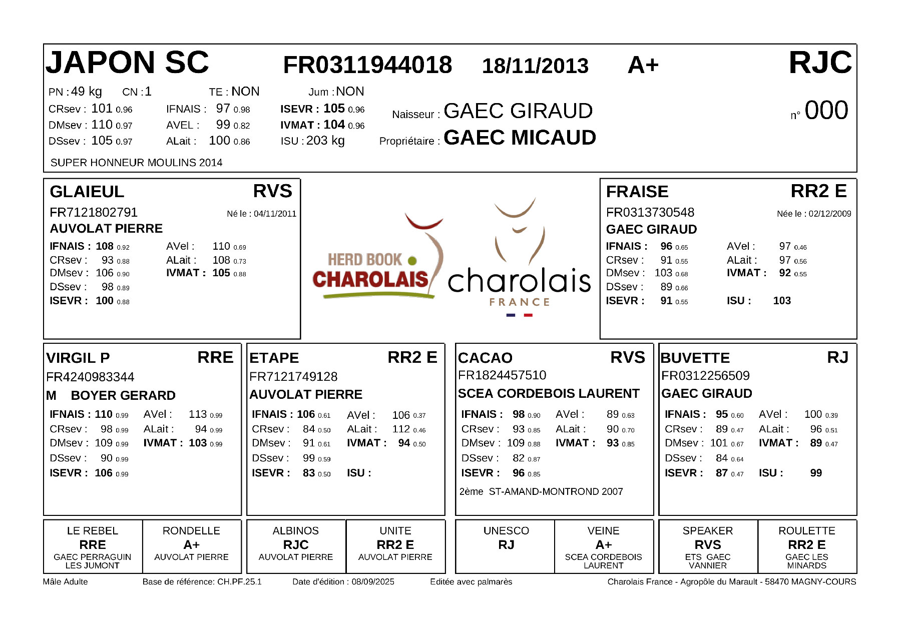 En bref on a ici un taureau génétiquement Sans-Corne qui vient répondre à un large panel des demandes actuelles : des animaux polled (hétérozygote) sans pour autant dégrader le potentiel, des facilités de naissance intéressante, une belle finesse d’os, un très bon grain de viande, des largeurs, de très bons bassins et des qualités de race haut de gamme !