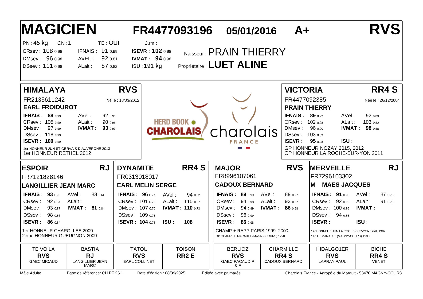 La mère de MAGICIEN est la célèbre VICTORIA qui a gagné de nombreuses récompenses en concours avec une distinction notable pour l’élevage Prain Thierry : trois 1er Prix de famille par la mère au concours national (source photos : Thierry Prain).