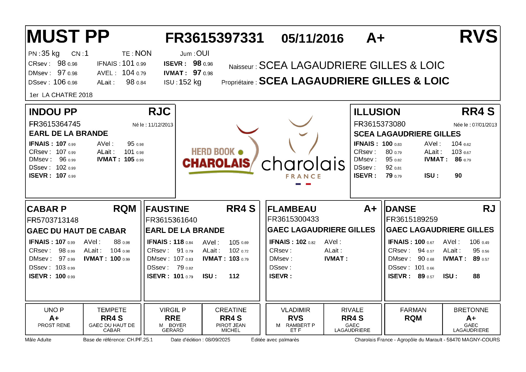 Vous êtes de plus en plus nombreux, en France et à l’étranger, à nous demander des animaux génétiquement Sans-Corne de qualité, nous collaborons donc avec la SCEA Lagaudrière Gilles et Loïc dans l’Indre pour vous proposer à l’insémination une de leurs dernières créations homozygotes pour ce caractère : MUST PP.