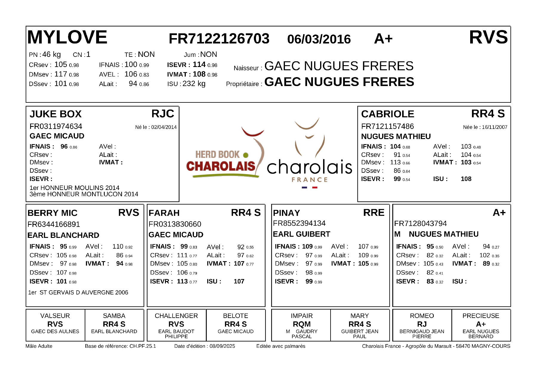 Cet animal utilisé dans les élevages Nugues Frères et Dutartre Laurent (71) transmet d’excellentes facilités de naissance, des dos extraordinaires, beaucoup de classe, du développement jamais sans finesse !