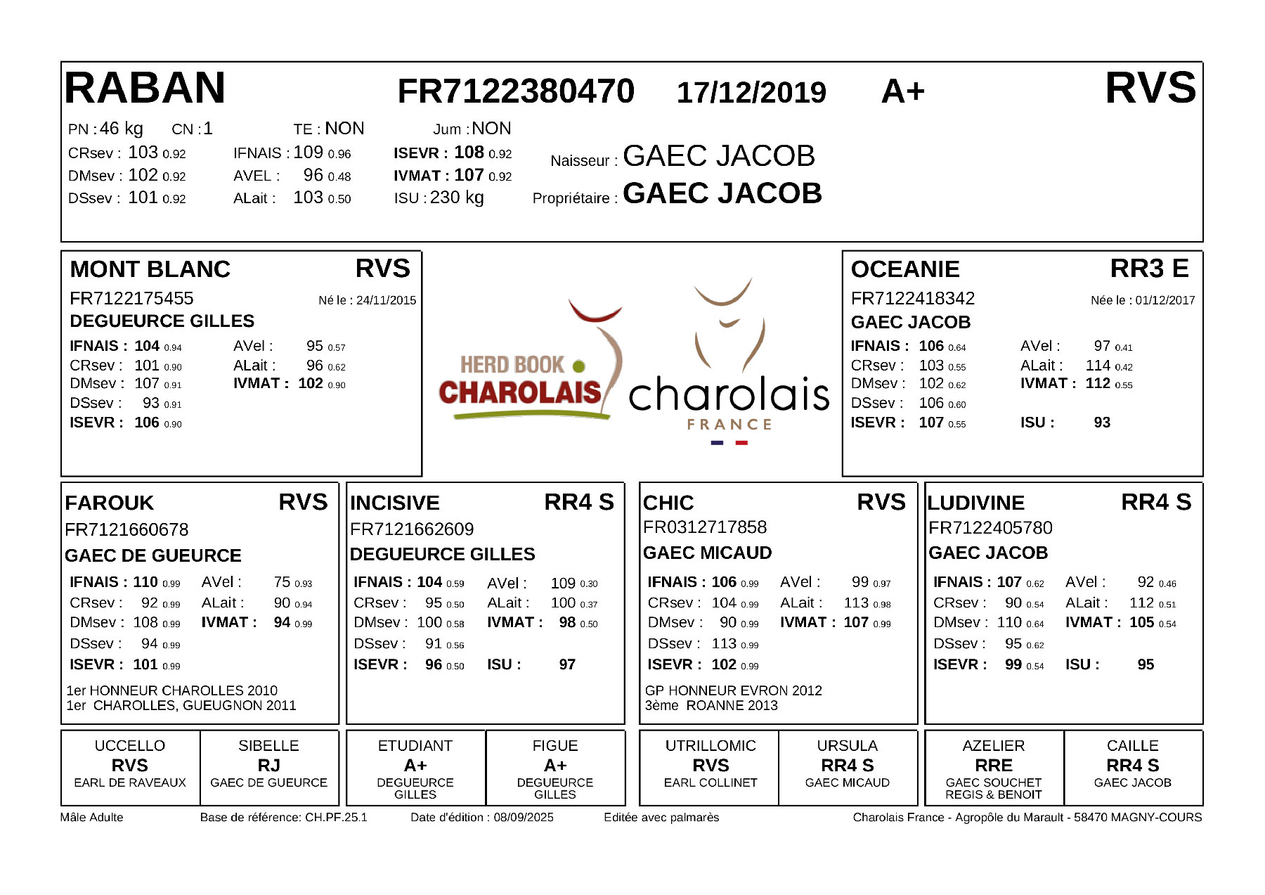 RABAN est en effet le produit d’un vêlage à 2 ans né petit. Il présente une belle longueur, de la finesse et beaucoup de pousse. Des points morphologiques très similaires à son grand-père CHIC (stock de semences épuisé) qui laissent présager un très bon renouvellement ! Du côté de la mère de RABAN on retrouve un gros cumul de valeurs maternelles, de qualifications, de facilités de naissance avec la très bonne CAILLE en troisième génération. Le père de RABAN , MONT BLANC, est quant à lui un des records de la station d’évaluation de Jalogny. Il est qualifié RVS et est issu d’un mix RVS – RR4S ! MONT BLANC a laissé une très belle production dans l’élevage Jacob en Saône-et-Loire avec d’excellents résultats en croissance et en conformation musculaire. Il provient quant à lui du très réputé FAROUK qui a marqué par ses facilités de naissance, ses masses musculaires et ses qualités de race.