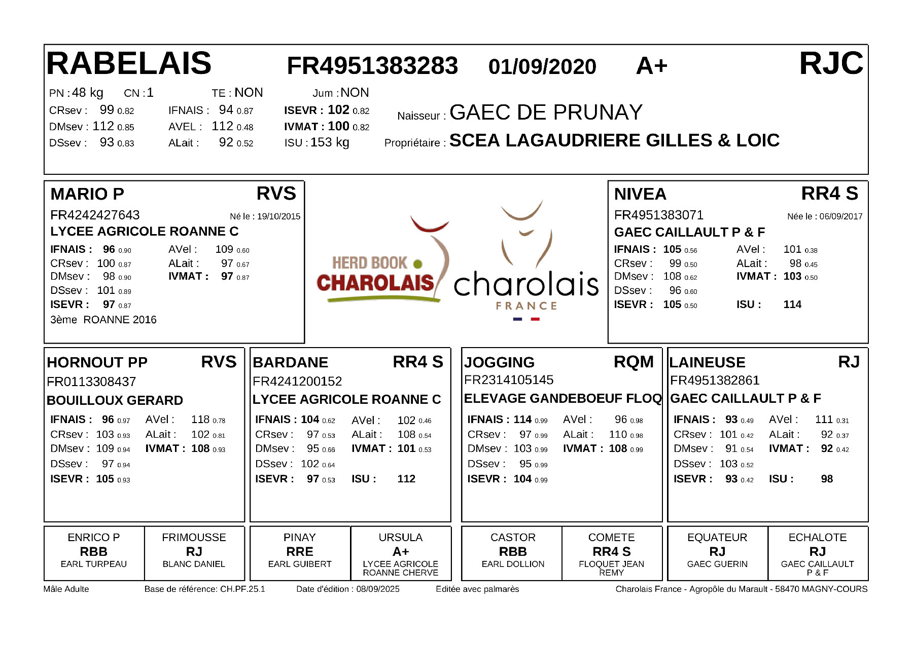 RABELAIS (PP) était un jeune reproducteur très bien conformé acquis par la SCEA LAGAUDRIERE Gilles et Loïc (36) au sein du GAEC DE PRUNAY (Messieurs Caillault) dans le Maine-et-Loire. Un animal qui présentait naturellement des masses musculaires très plaisantes (hétérozygote F94L), un très bon bassin et de bonnes qualités de race.