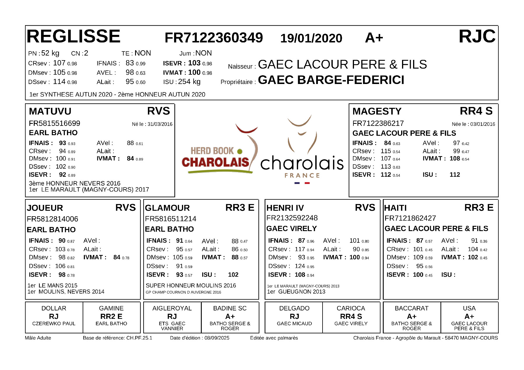 Repéré à son plus jeune âge par sa morphologie très attrayante et surtout par son dessus exceptionnel, il n’a fait qu’évoluer du bon côté au cours de l’année ce qui lui a valu de décrocher le titre de Champion Réserve au concours d’Autun dans sa catégorie. On ne peut que souligner tout le potentiel de cette lignée et le savoir-faire de ses naisseurs, le GAEC Lacour (71), qui ont su faire le croisement idéal et réussir avec brio sur les plus grands concours de la race: notez que 3 pleines-soeurs de REGLISSE ont obtenu respectivement les prix de Championnat à Autun, Gueugnon et Charolles en finissant par le Prix de la Fédération à la finale de Moulins en 2019.