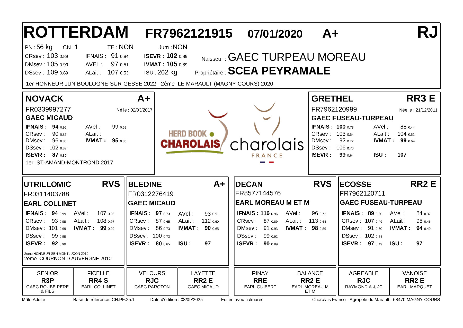Sélectionné par nos soins autour de la vente du Grand Ouest de La Roche-sur-Yon 2021, cet animal présentait déjà un gabarit très supérieur à la moyenne avec en plus beaucoup de qualités de race, un super dessus et un très bon bassin. Des lignes qu’on retrouve bien chez ses ascendants avec au loin de grands raceurs qui ont marqué les esprits et fixé de remarquables bases d’élevage dans les troupeaux. Vous pourrez remarquer au bas de cette page un profil génomique très complet et positif avec notamment une note d’aptitude à l’allaitement de 115 !