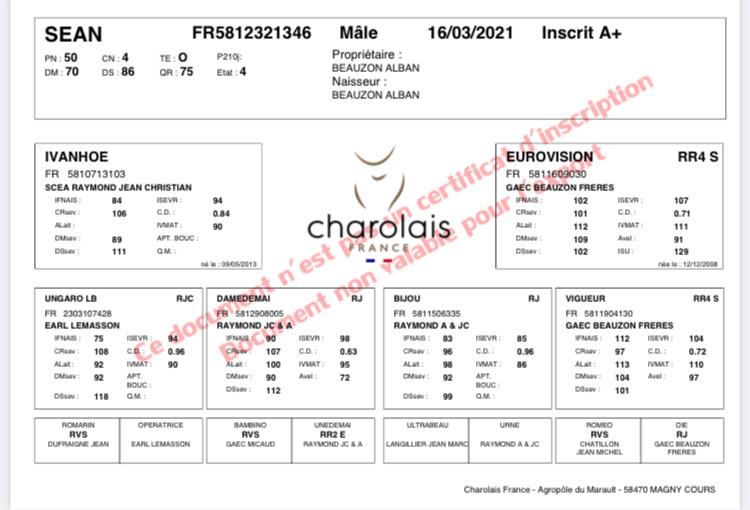 « A very nice well-balanced animal full of breed qualities ! Moreover, he won the “Bien Naître” 1rst Prize in Gueugnon in 2021. »
