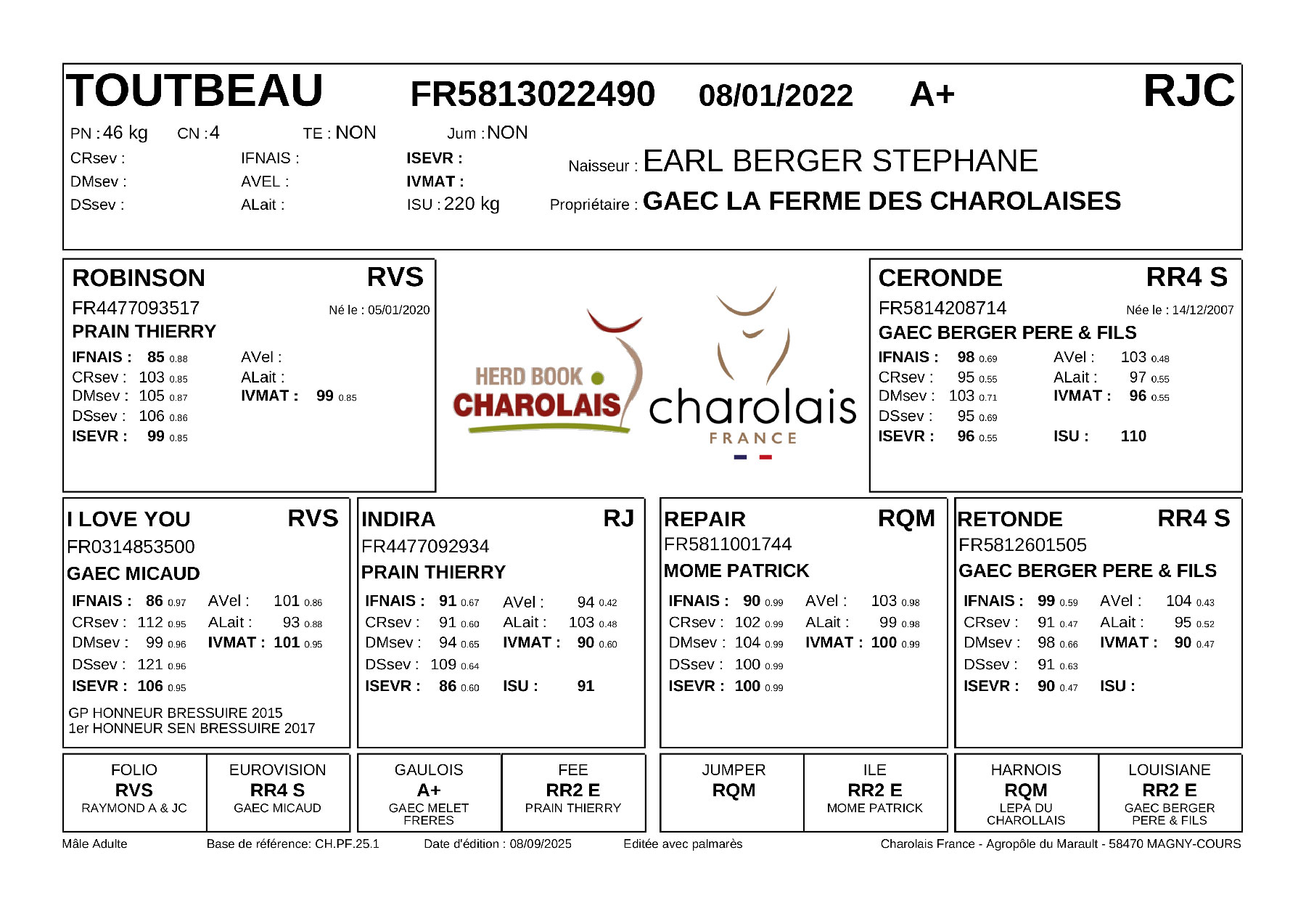 Une finesse de peau impressionnante qu’il a conservé avec l’âge, un super carré de bassin et le couard de queue toujours très sec… Sa mère n’a fait que conforter notre choix: une vieille vache de 14 ans très lourde, fine, épaisse et très laitière… voyez par vous-même! Merci à nos amis de l’Aveyron, amateurs d’animaux de qualité, pour la transmission de ces très belles photos! Du côté de son père on retrouve en plus I LOVE YOU en deuxième génération qui permet de cumuler le fort potentiel de croissance et les qualités de bassin en plus des masses musculaires. Cet animal a donc été sélectionné pour la vente de Cercy-La-Tour en 2022 où il a fait de nombreux envieux avant de rejoindre finalement l’entreprise FABROCA en Belgique, dirigée par Benoit Cassart. Porteur homozygote Q204X (Q204X/Q204X)Non porteur F94L