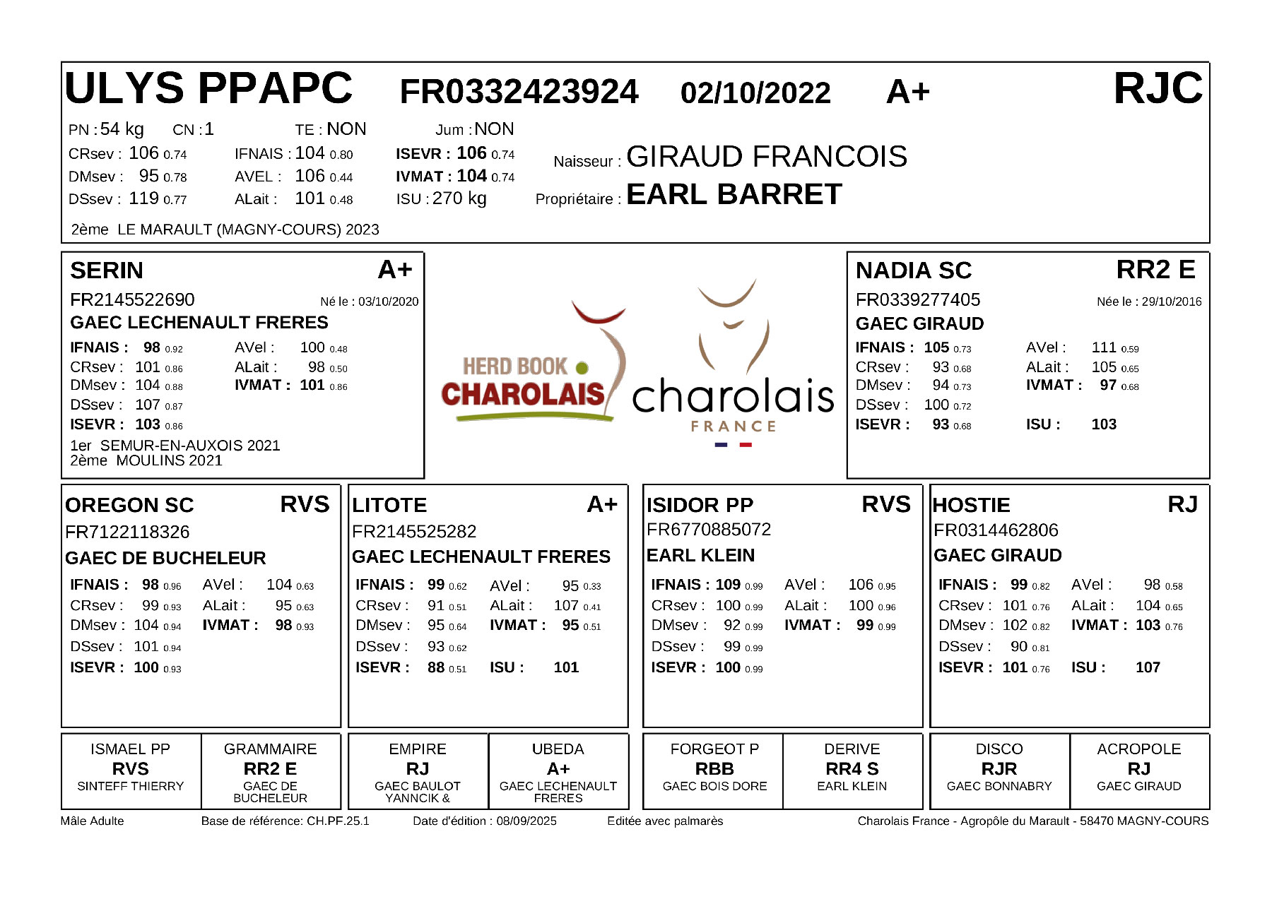 On retrouve ici un père acheté à la vente de Cercy-La-Tour où il se démarquait lui aussi dans la catégorie des animaux d’automne et plus particulièrement des sans-cornes avant d’obtenir un 1er Prix au concours de Semur-en-Auxois. Une toute nouvelle origine qui permettait une utilisation massive dans les élevages des frères Giraud. Contrat rempli avec une très grosse production régulière couplée à un fort potentiel, notamment en femelles et des facilités de naissance positives.