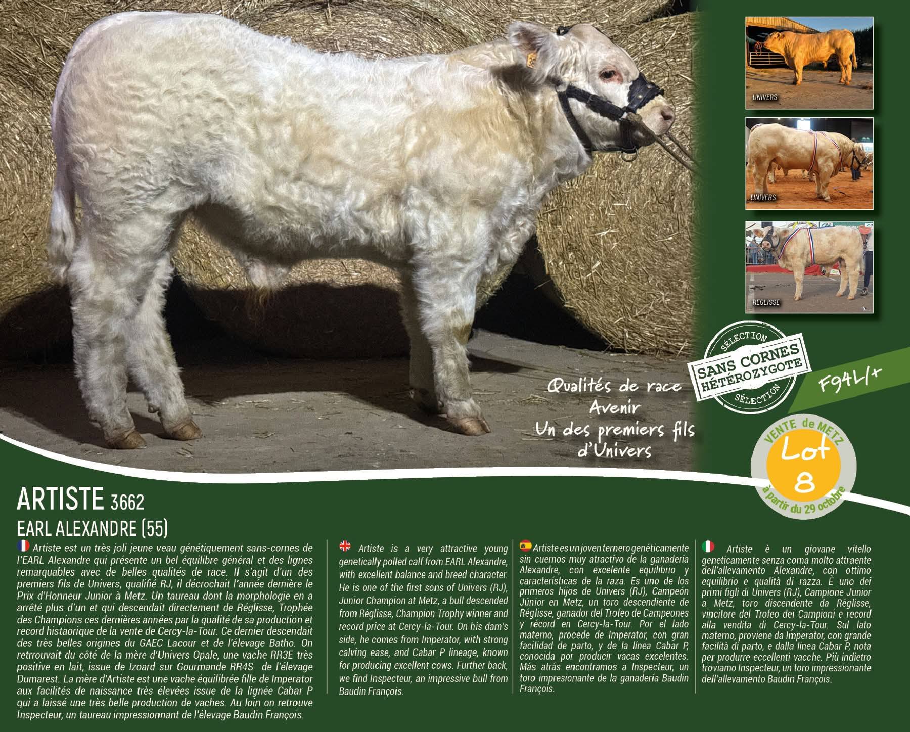 ARTISTE a finalement été prisé à la vente de Metz et a rejoint les très bons élevages Poyet David dans le Rhône et Kessler Samuel dans le Cher.