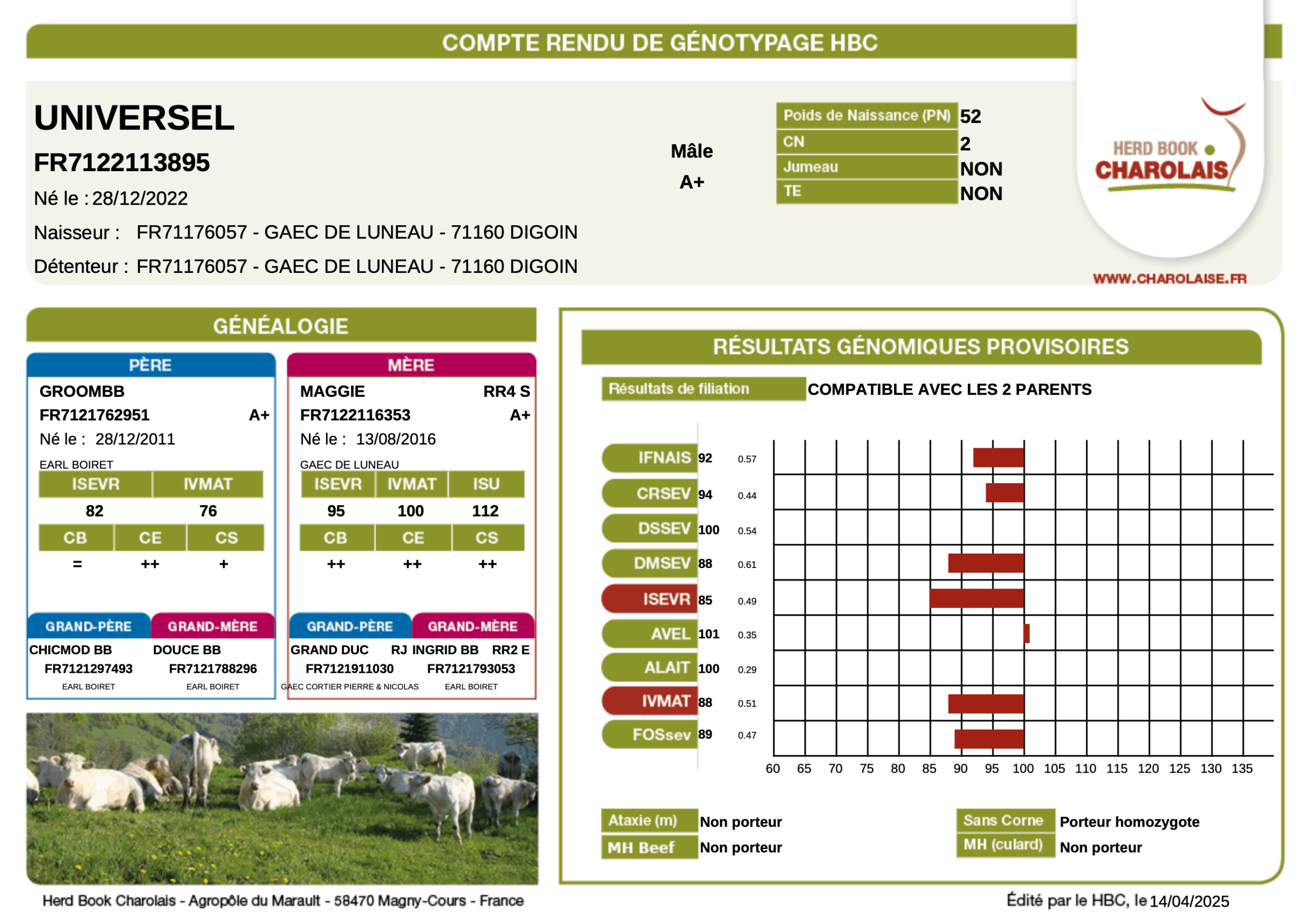 UNIVERSEL est un tout jeune homozygote sans-cornes équilibré de l’élevage GAEC DE LUNEAU. Il s’agit d’un taureau qui se démarque par ses qualités de race, sa morphologie très complète et ses aptitudes fonctionnelles irréprochables.