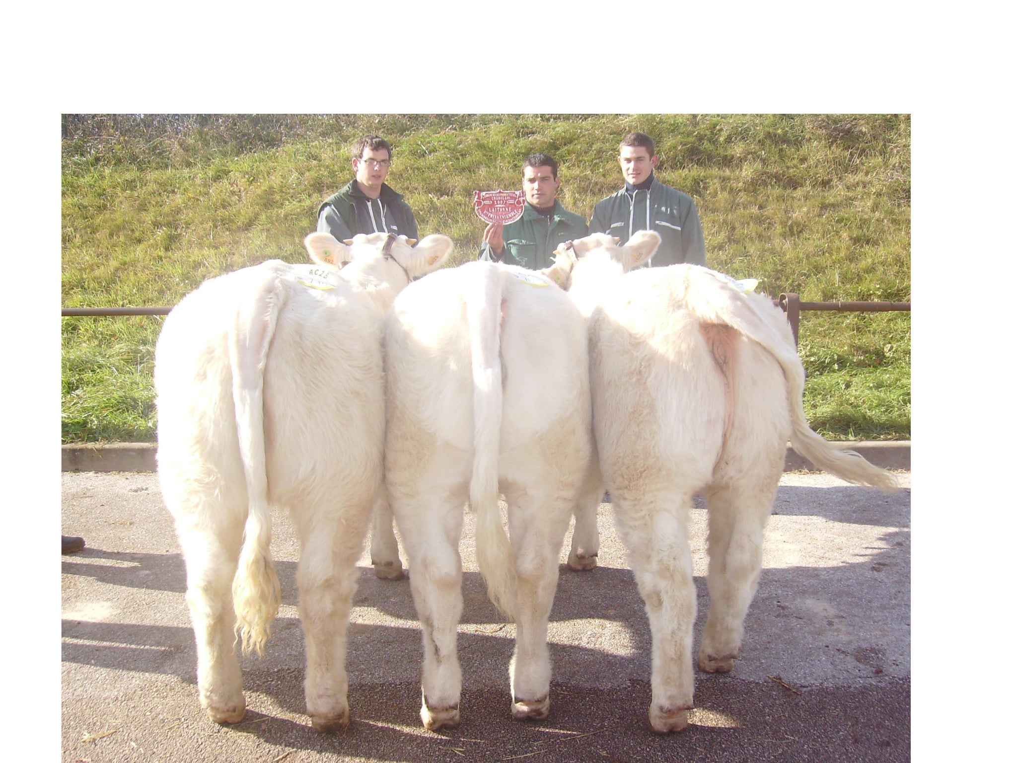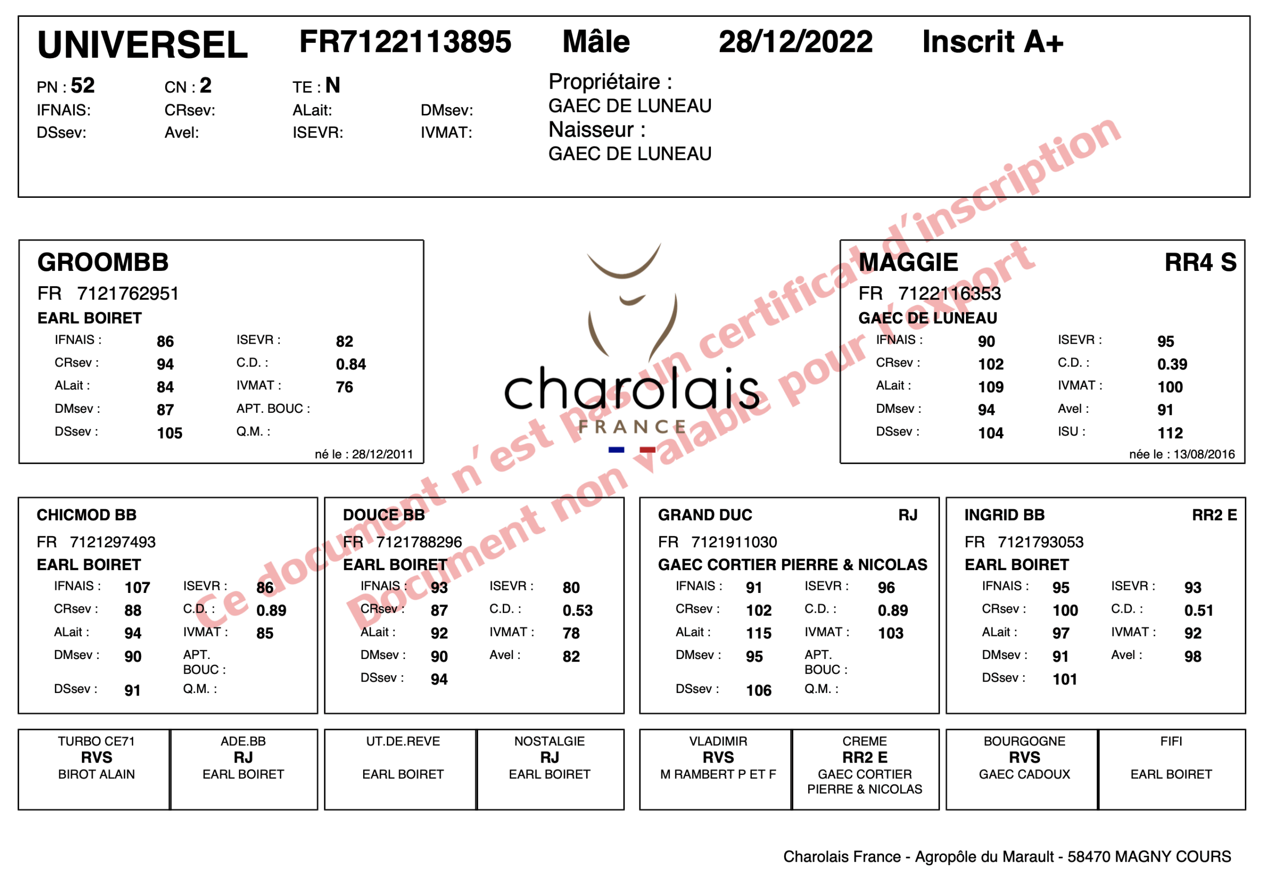 Du côté de ses origines on a ici un pédigrée très facile à utiliser avec de belles origines de l’élevage Boiret. Malgré la double présence du gène sans-cornes, on retrouve très rapidement des taureaux marquants de la race Charolaise. Son père GROOM BB a laissé une belle production avec du cadre et de belles qualités de race. Quant à sa mère, il s’agit d’une belle vache provenant d’un fort cumul de qualités maternelles aux origines fixées: VLADIMIR, CREME, BOURGOGNE, PACHA, NOBLESSE…. Retrouvez dans ses origines la très belle CREME, la mère de GRAND DUC ainsi que deux de ses soeurs par le père VOSGIEN lorsqu’elles décrochaient le 1er prix d’ensemble veaux femelles de l’année à Charolles en 2007. Merci à Nicolas Cortier de nous avoir partagé ces beaux souvenirs.