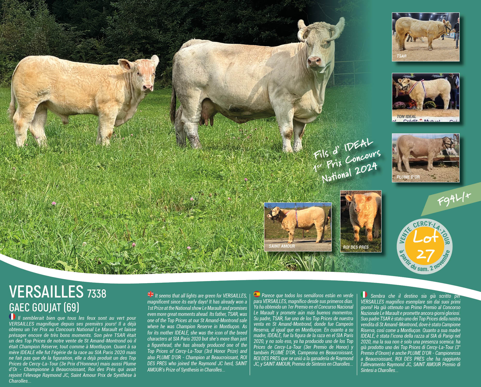 Un animal qui a fait des envieux à Cercy-La-Tour en 2024 après avoir eu un 1er Prix au Concours National Veau au Marault et un 1er Prix à Cercy-La-Tour, un des top prices de la vente qui fait aujourd’hui le bonheur de ses co-propriétaires le GAEC BARGE FEDERICI, EARL GUILLAUME MATHIEU, EARL DE LA PRASLE en Saône-et-Loire et M. LUCAND François en Côte-d’Or.