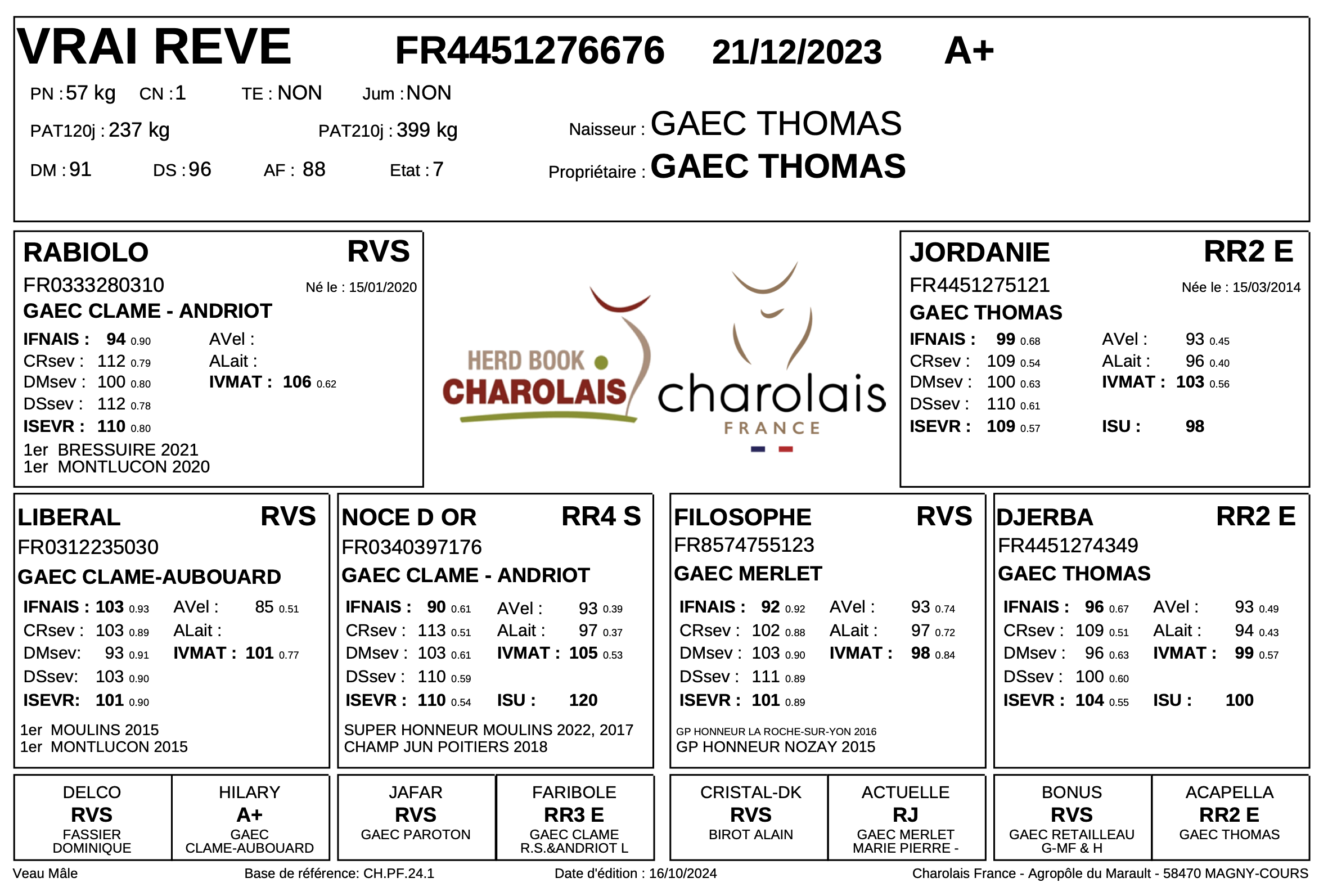 VRAI REVE porte plutôt bien son nom… né au GAEC Thomas en Loire-Antlantique, ce jeune reproducteur aura largement fait parler de lui en 2024 puisque, après avoir décroché le Top Price de la vente SG de l’Ouest par les élevages GAEC De La Vallée Blanche, Darantier Michel, Gomel Nicolas, Hertault Julien, EARL Cury, GAEC Des Charmilles, GAEC Vauthier, Vauthier Antoine GAEC Barré Charline et Romain, Barré Dominique et Jacoby Sébastien (Belgique) , il a finalement brillé au concours de Moulins en obtenant un 1er Prix et le Prix de l’AJEC. Un animal qui se démarquait dès son plus jeune âge par des qualités de race hors de commun, un équilibre très plaisant, de la puissance à tous les niveaux, une correction parfaite et de belles largeurs ! Voyez plutôt…